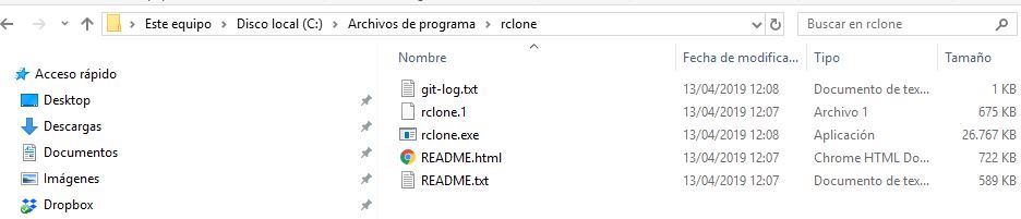Descomprimimos el archivo que nos hemos descargado y lo ubicamos en C:Program Filesrclone