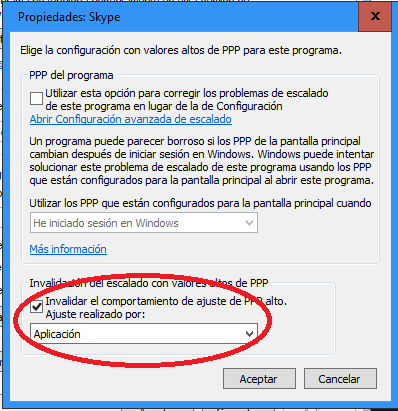 Se nos abrirá una pantalla nueva donde debemos marcar la opción Invalidar el comportamiento de ajuste PPP alto. Y marcar la opción Aplicación. Eso realizará un ajuste a nivel de esa aplicación evitando el visionado borroso de los menús.