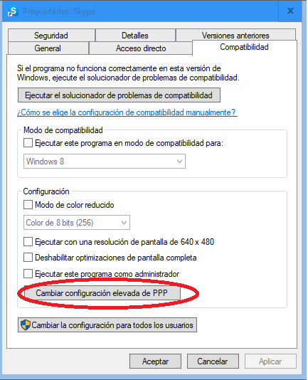 Podemos solventar la papeleta en el acceso directo a dicho programa. Simplemente click con el botón derecho en el acceso directo y nos vamos a compatibilidad y dentro pulsaremos en Cambiar configuración elevada de PPP.